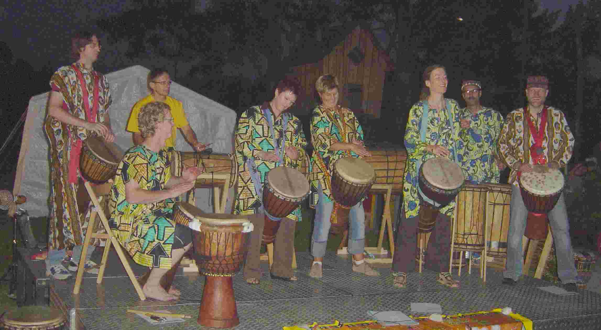 Besetzung - zwei Mädels und fünf Buam - afrikanische Rhythmen